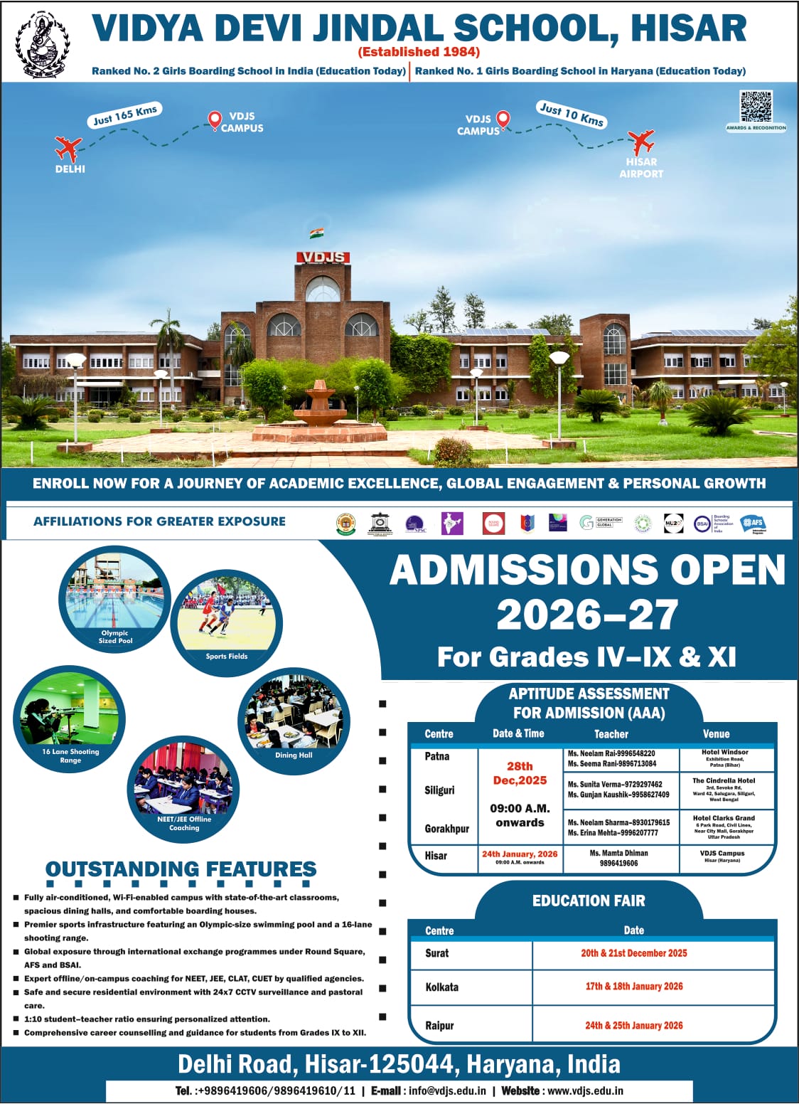Registrations open for admission for Session 2026-27. The Aptitude Assessment for Admission is scheduled on January 24, 2025 (Online & Offline mode) at Vidya Devi Jindal School Campus. Hisar. December 20 & 21 at Surat, December 28, at Patna, Siliguri & Gorakhpur, Kolkata on January 17 & 18, 2026, Raipur on January 24 & 25, 2026. For further details kindly visit our Website’s www.vdjs.edu.in & follow ‘Admission Page’
